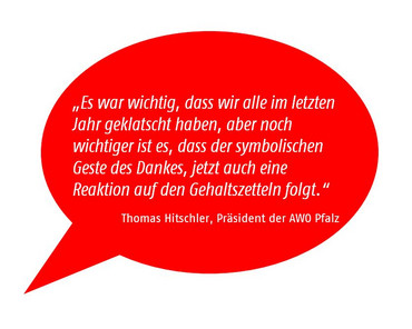 Thomas Hitschler, Präsident der AWO Pfalz, freut sich über die Tarifeinigung: „Mit der deutlichen Gehaltserhöhung zeigen wir, dass für uns etwas im Vordergrund steht: zufriedene Mitarbeiterinnen und Mitarbeiter und damit auch ein Höchstmaß an Professionalität in der Pflege. Es war wichtig, dass wir alle im letzten Jahr geklatscht haben, aber noch wichtiger ist es, dass der symbolischen Geste des Dankes, jetzt auch eine Reaktion auf den Gehaltszetteln folgt.“