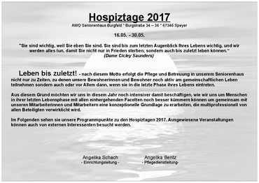 Leben bis zuletzt! - nach diesem Motto finden in diesem Jahr die Hospiztage vom 16.05. bis zum 30.05.2017 in Speyer statt. Informieren Sie sich über wichtige Themen wie Patientenverfügung oder Ernährung und Wundversorgung im Palliativbereich.