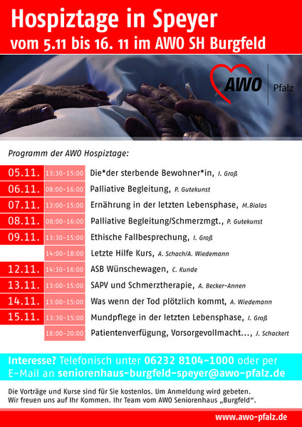 Leben bis zuletzt! - nach diesem Motto finden die Hospiztage vom 5.11 bis 16.11. im Seniorenhaus „Burgfeld“ in Speyer statt. An diesen Tagen finden kostenlose Kurse und Vorträge statt - von Palliativbegleitung, Ernährung in der letzten Lebensphase oder Schmerzmanagement bis hin zu einem ein Letzte Hilfe Kurs oder Patientenvorsorge. Das komplette Programm finden Sie hier.