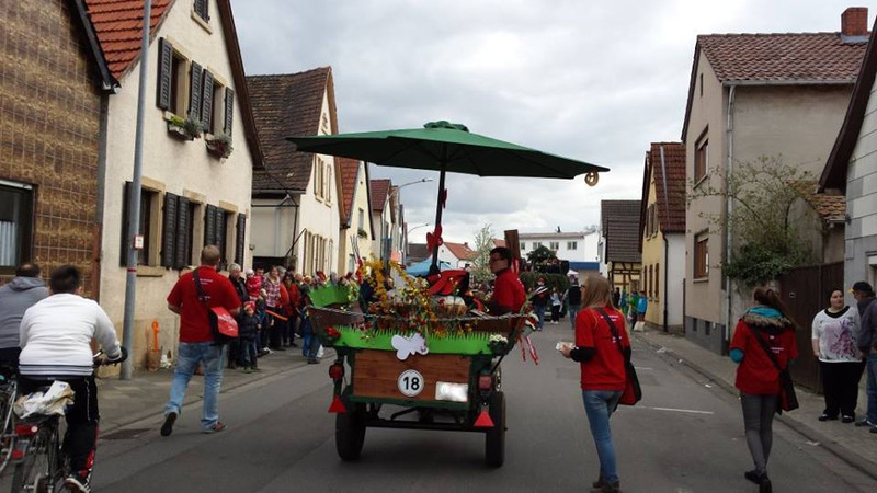 Mit dem Wagen mit Motto Frühlingswiese zogen die Mitglieder durch Hasslocher Straßen und verteilten großzügig Süßes an Hasslocher Kinder.