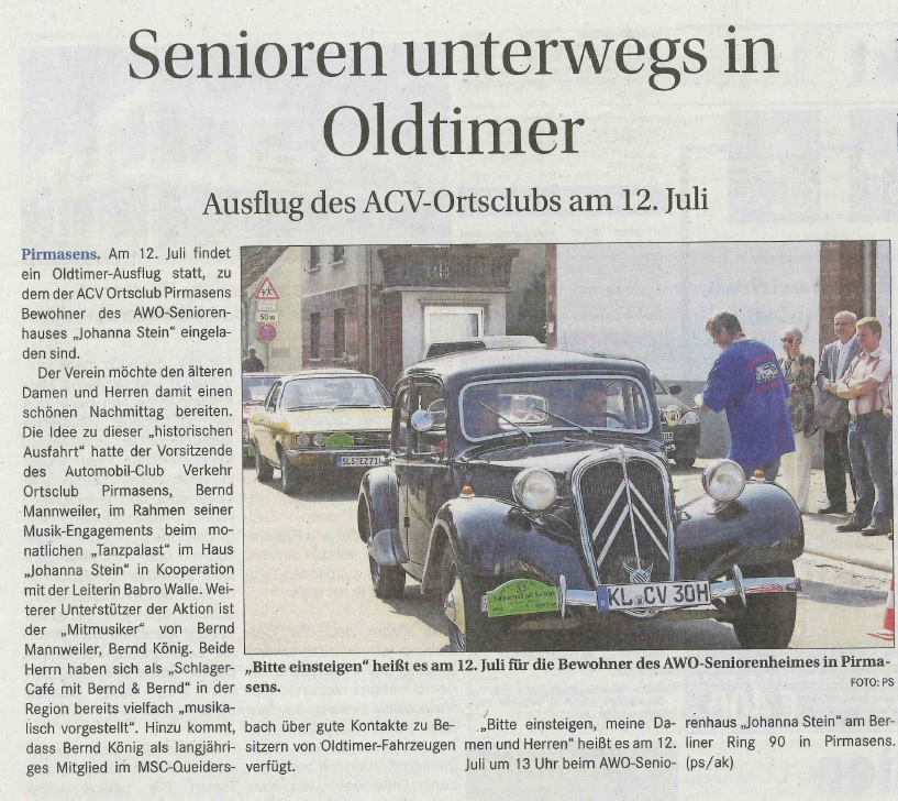 Pirmasens. Der ACV Ortsclub Pirmasens bietet unseren Bewohnern des Seniorenhauses "Johanna Stein" am 12. Juli einen Ausflug der besonderen Art - eine Fahrt im Oldtimer.