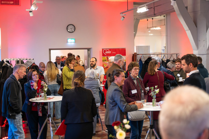 Es folgte die gemeinsame Diskussion und Arbeit in Workshops. Es gab drei Workshops, von denen je zwei belegt werden konnten: „Ethische Werte der digitalen Teilhabe - erkennen verstehen und Verantwortung leben“ (Leitung: Dr. Nicole Thiemer), „Vereinsleben - profitieren durch Digitalisierung“ (Leitung: Dr. David Emling) und „Praktischen Herausforderungen der Digitalisierung durch ehrenamtliche Angebote begegnen“ (Leitung: Annette Tinschert). Zwischen den Workshops kam Dörte Schall, rheinland-pfälzische Ministerin für Arbeit, Soziales, Transformation und Digitalisierung für ein Grußwort ins Alte Kaufhaus. Sie betonte den Bedarf, über soziale Themen zu sprechen und wies darauf hin, dass nicht nur die Kosten des Sozialstaats im Fokus stehen dürften, sondern auch beachtet werde müsse, was es kostet, wenn es den Sozialstaat nicht geben würde. Es ist wichtig, dass jemand da ist, der den Sozialstaat bei dessen vielfältigen Aufgaben, insbesondere durch das Ehrenamt, unterstützt. Dazu gehört auch die AWO Pfalz. Das Thema Digitalisierung entwickelt sich stetig weiter. Sie ermutigte auch ältere Menschen dazu weiter selbst an der Teilhabe zu arbeiten.